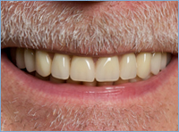 He opted for sedation and 6 implants were placed into his upper jaw. These were restored with a fixed bridge over the following 12 weeks giving a spectacular cosmetic and functional result